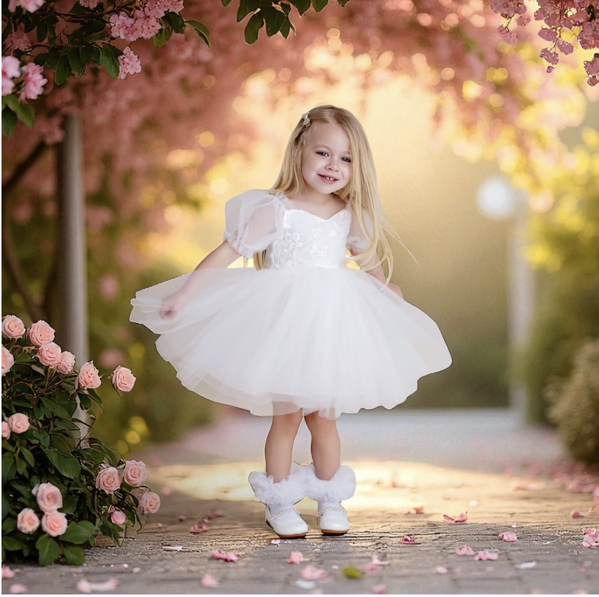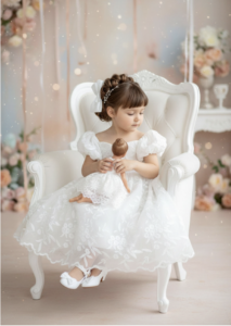 The white dresses at Lilli fara are anything but plain. Layers of soft chiffon, dimensional lace appliqué, and subtle shimmer create depth and elegance without overwhelming the child. The designs highlight delicate beauty while keeping the overall look refined and gentle.